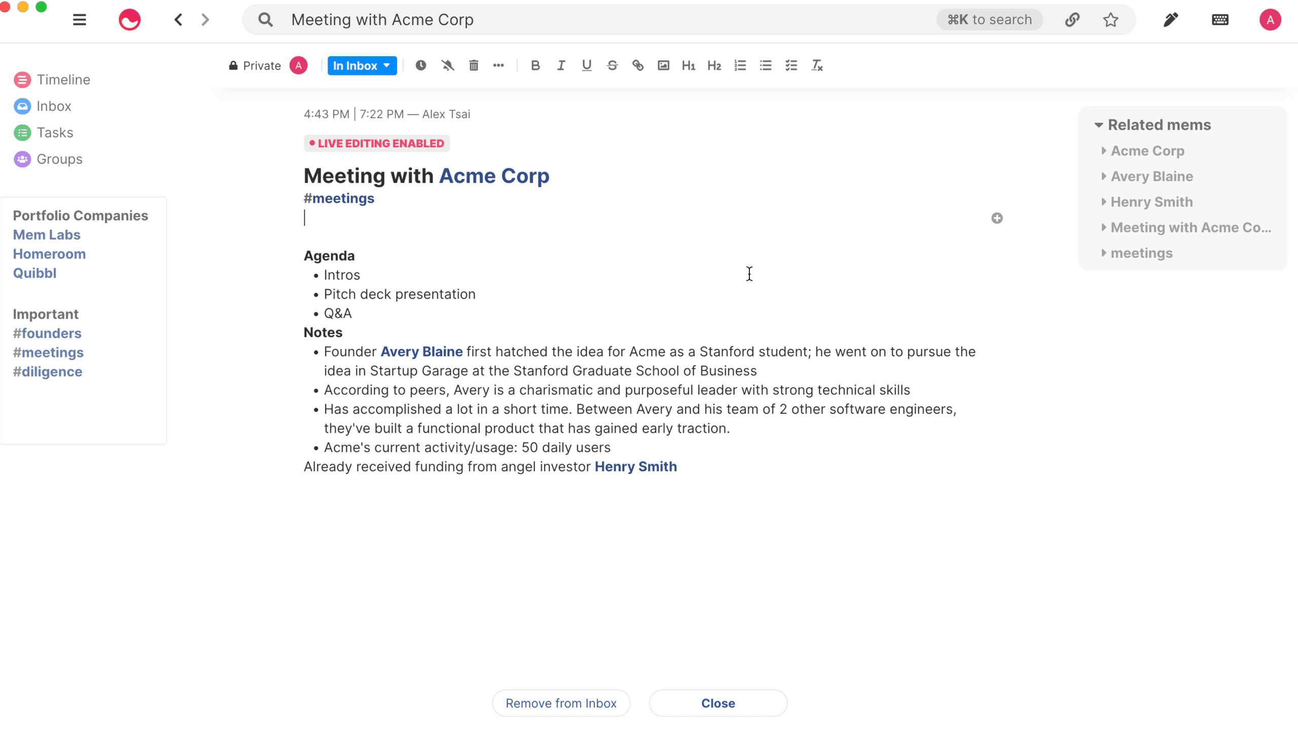 To share a mem with someone who doesn't have a Mem account, just @ mention the name of any person in any mem, select the “Invite” option, and enter their email address. We'll invite them to Mem and notify them that you've shared a mem via email. They’ll be able to view and collaborate instantly on the mem you shared, even without signing in to Mem. They’ll also have the option to sign into Mem and skip the waitlist.