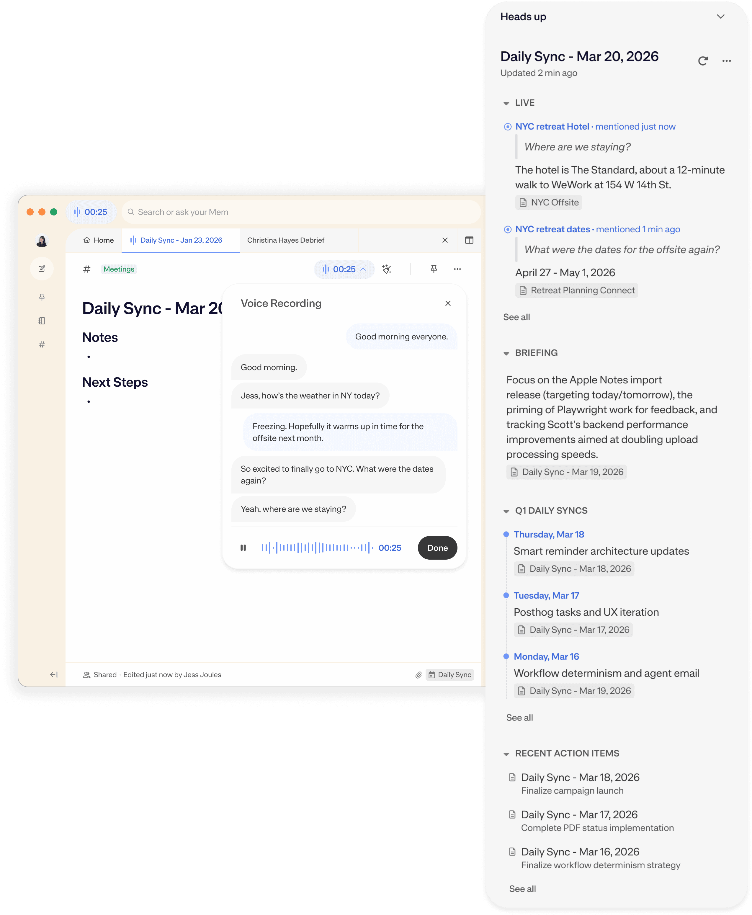 Heads Up Live is a Pro feature that makes Heads Up proactive during any Voice Mode session. Heads Up analyzes the transcript of an active recording and identifies topics being mentioned, surfacing relevant notes from your workspace in real time. Available on Web and Desktop.