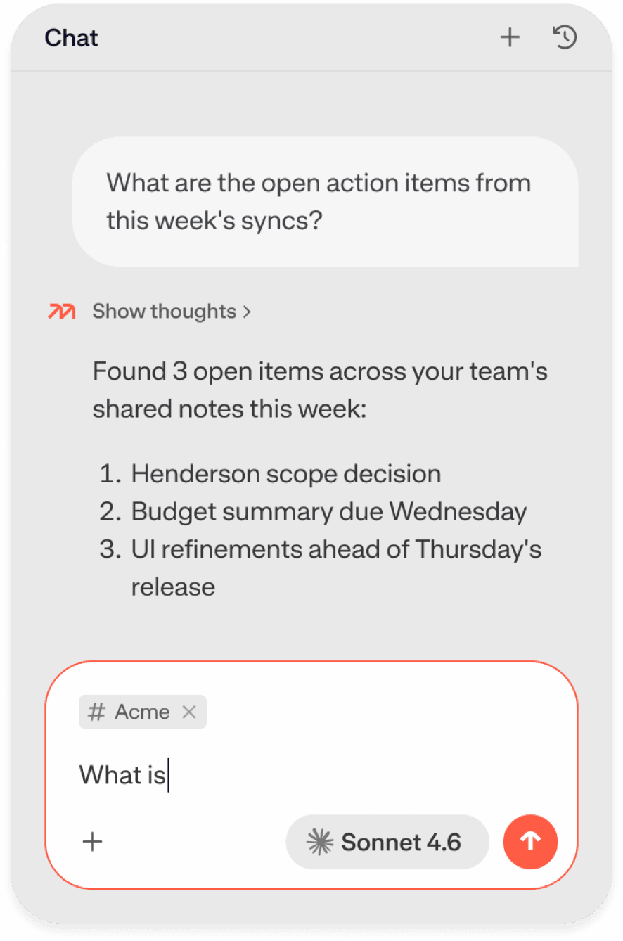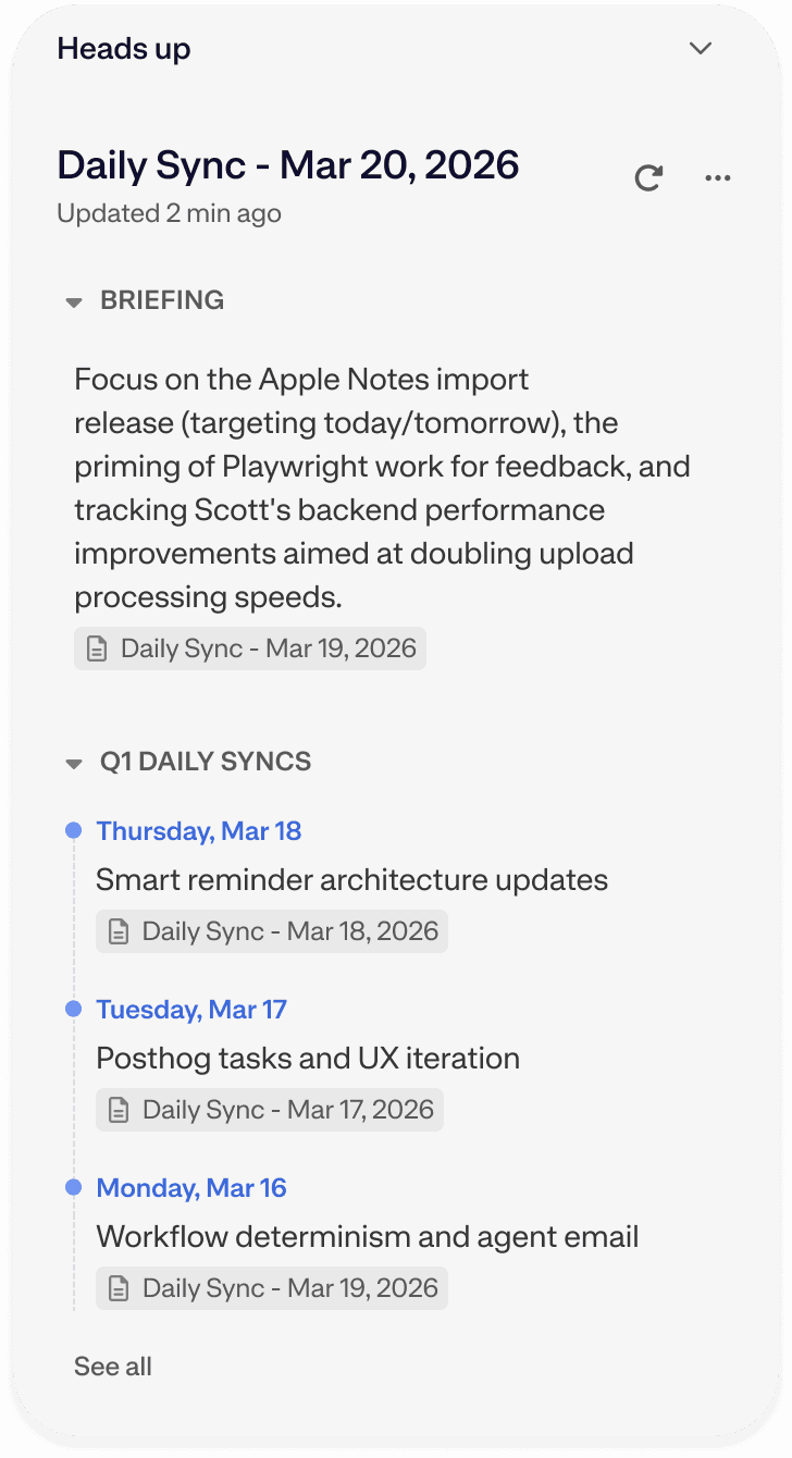 Briefings is a Pro feature that automatically generates a summary of relevant context in the Heads Up panel before each meeting from your calendar integration. Walk into every meeting knowing what was covered last time and what's still outstanding, without having to search or ask.