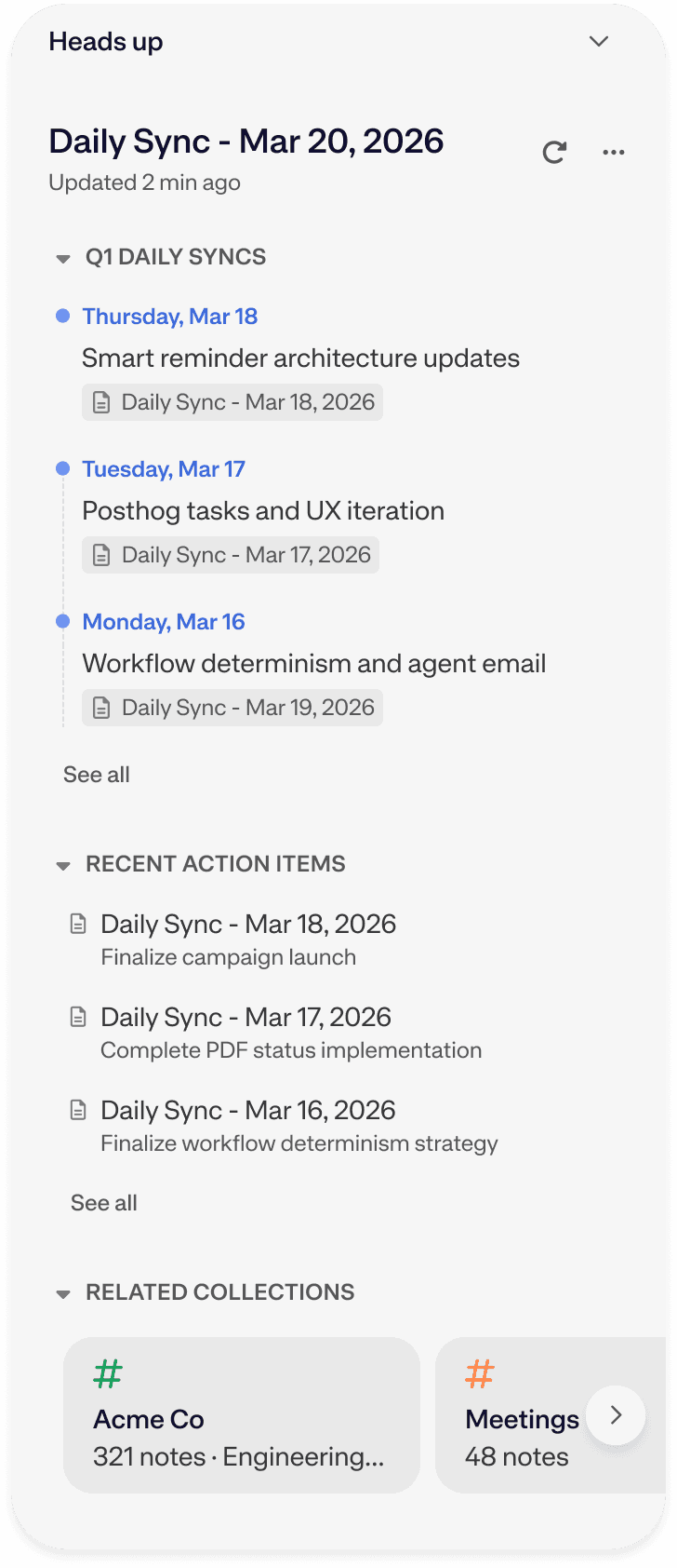 The moment you create or open a note on Mac, Windows, Web, or iOS, Heads Up surfaces relevant notes organized into clear sections.
