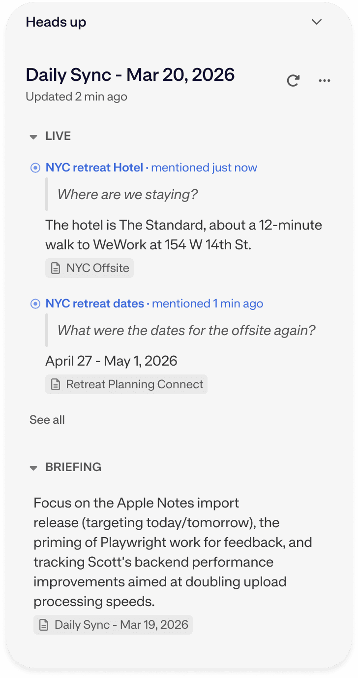 Heads Up is Mem's real-time context panel. The moment you open or create a note, Mem looks at who you're meeting with, what's being discussed, and what you're working on—then surfaces relevant notes before you think to look for them.