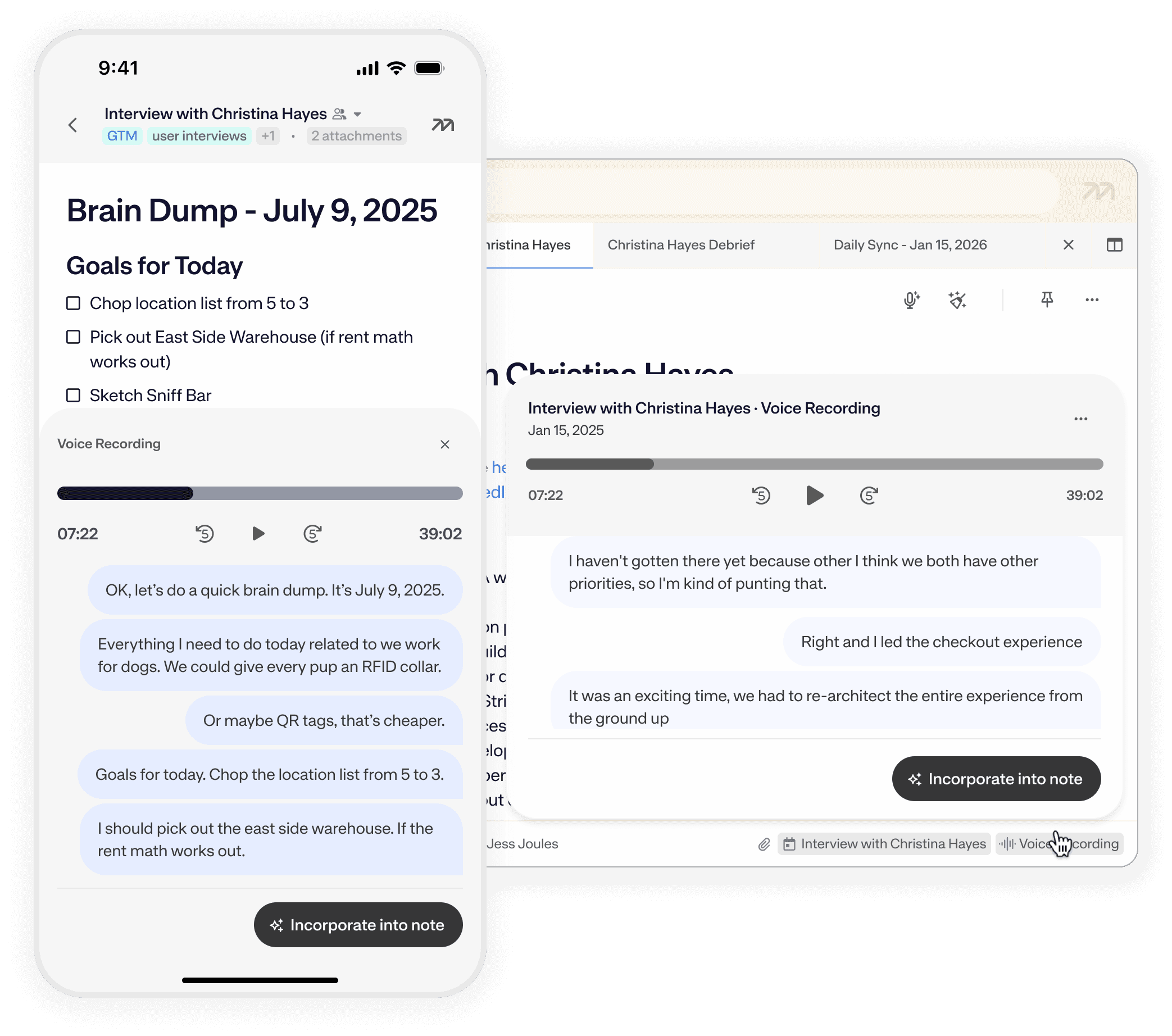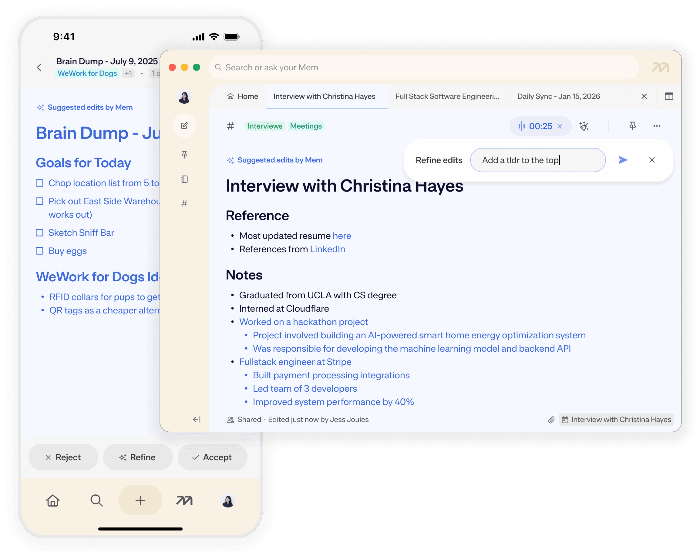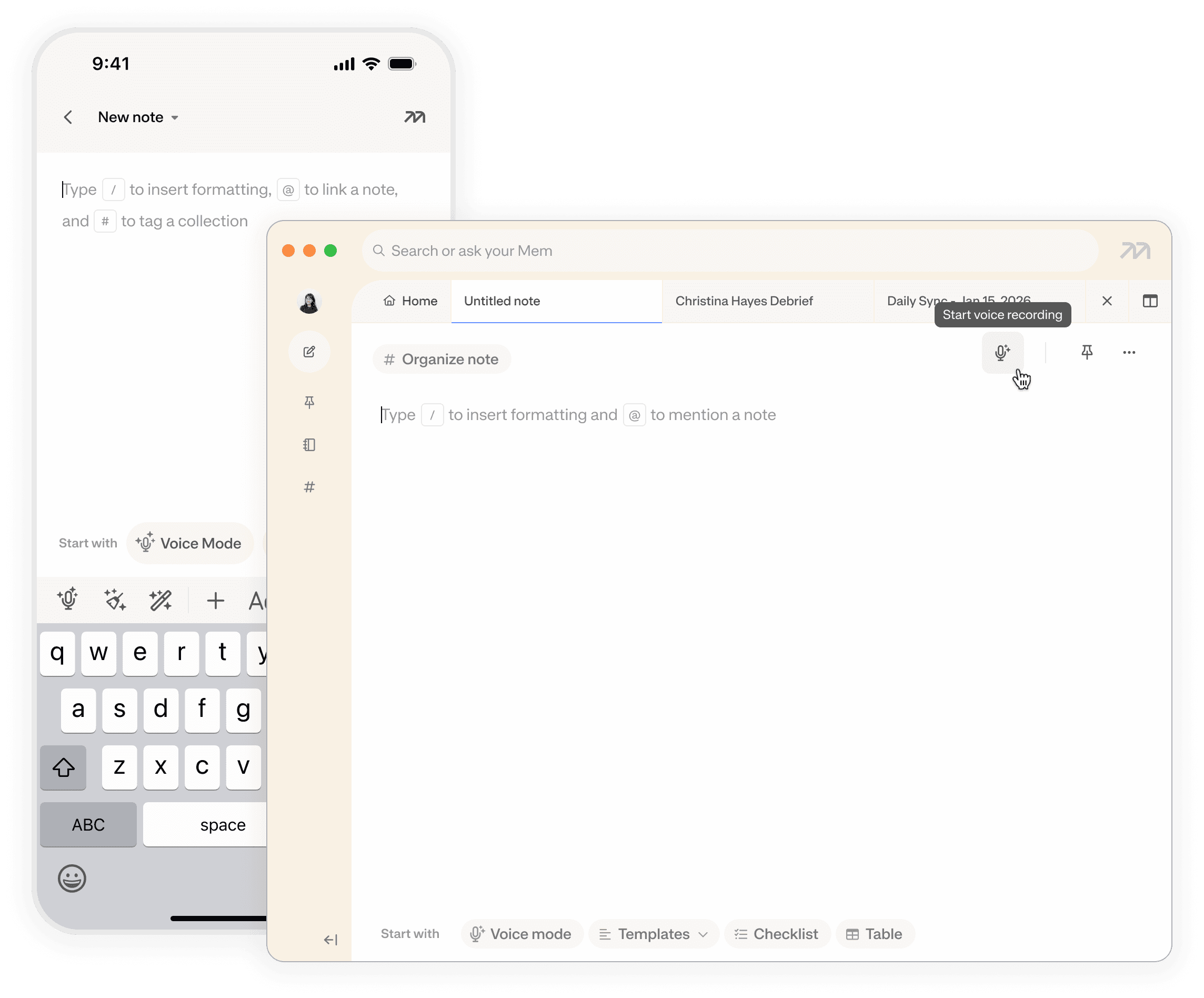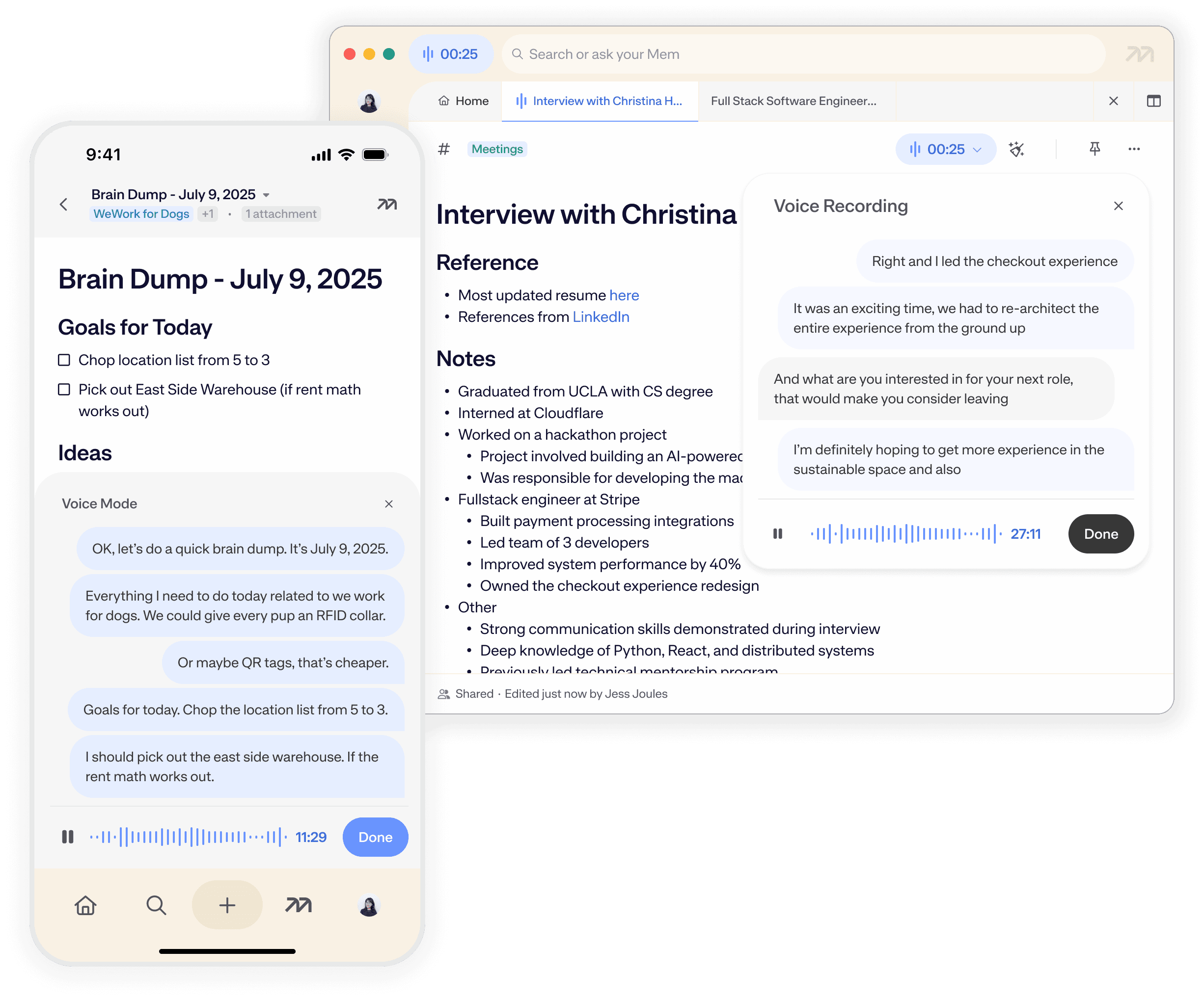 Mem records system audio and your microphone locally, and will never interrupt your meetings.