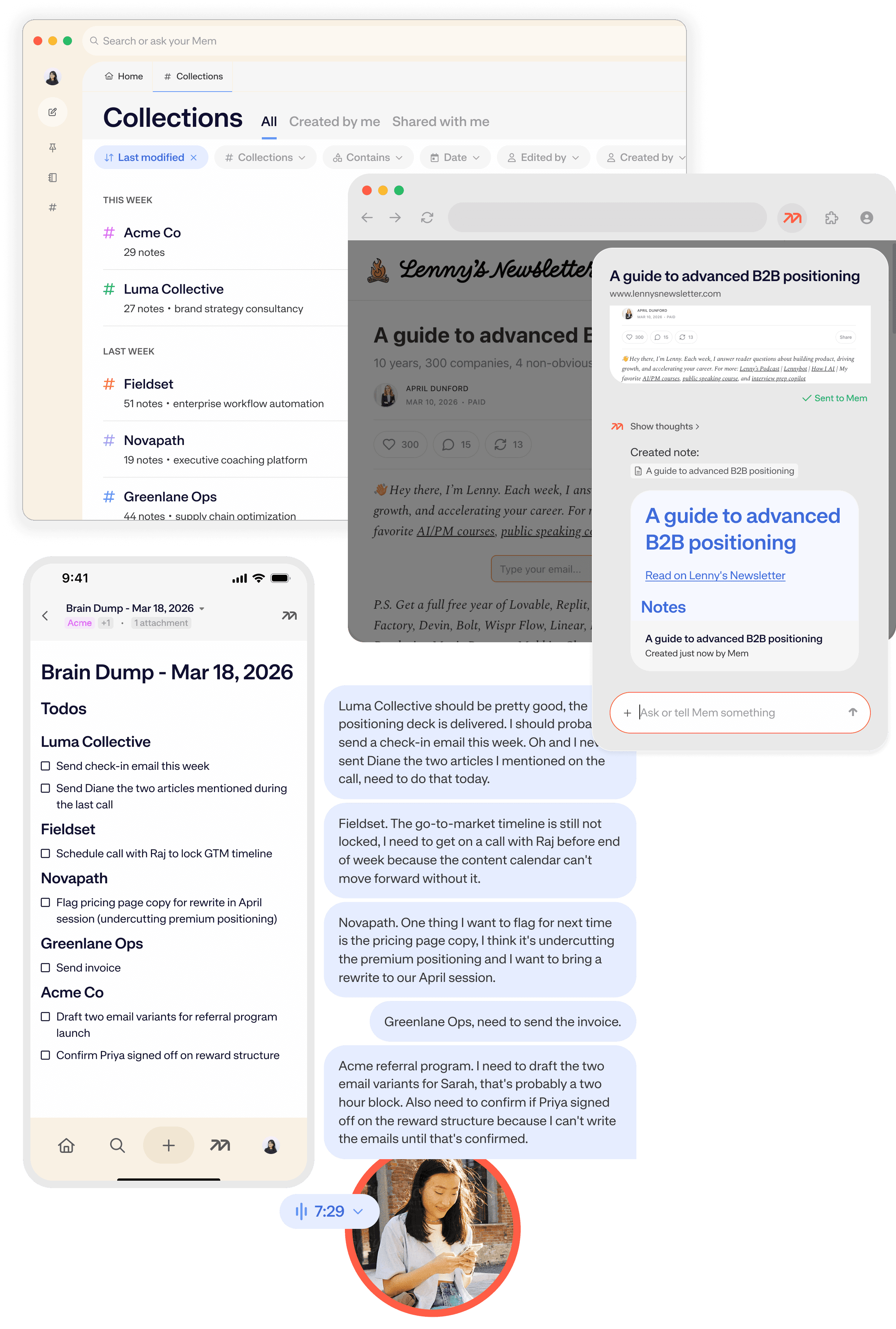You're running multiple client relationships at once, each with its own history, learnings, and roadmap. Mem keeps all of it organized and surfaces exactly what you need before a call, during a project, and when it's time to deliver.