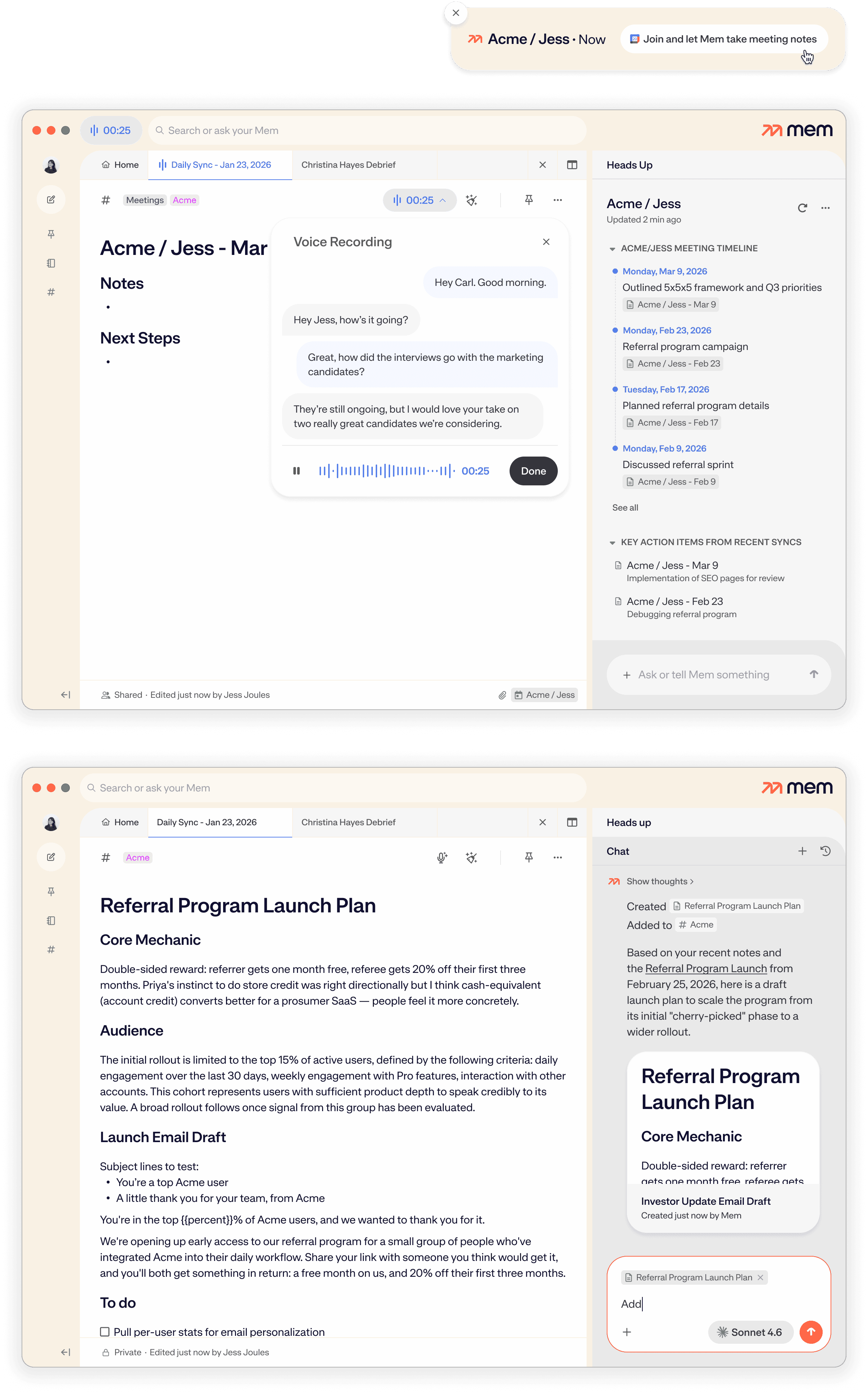 You're not managing one project — you're managing five at once, each at a different stage, each with its own stakeholders and history. Mem keeps every engagement organized without the overhead of maintaining a system.