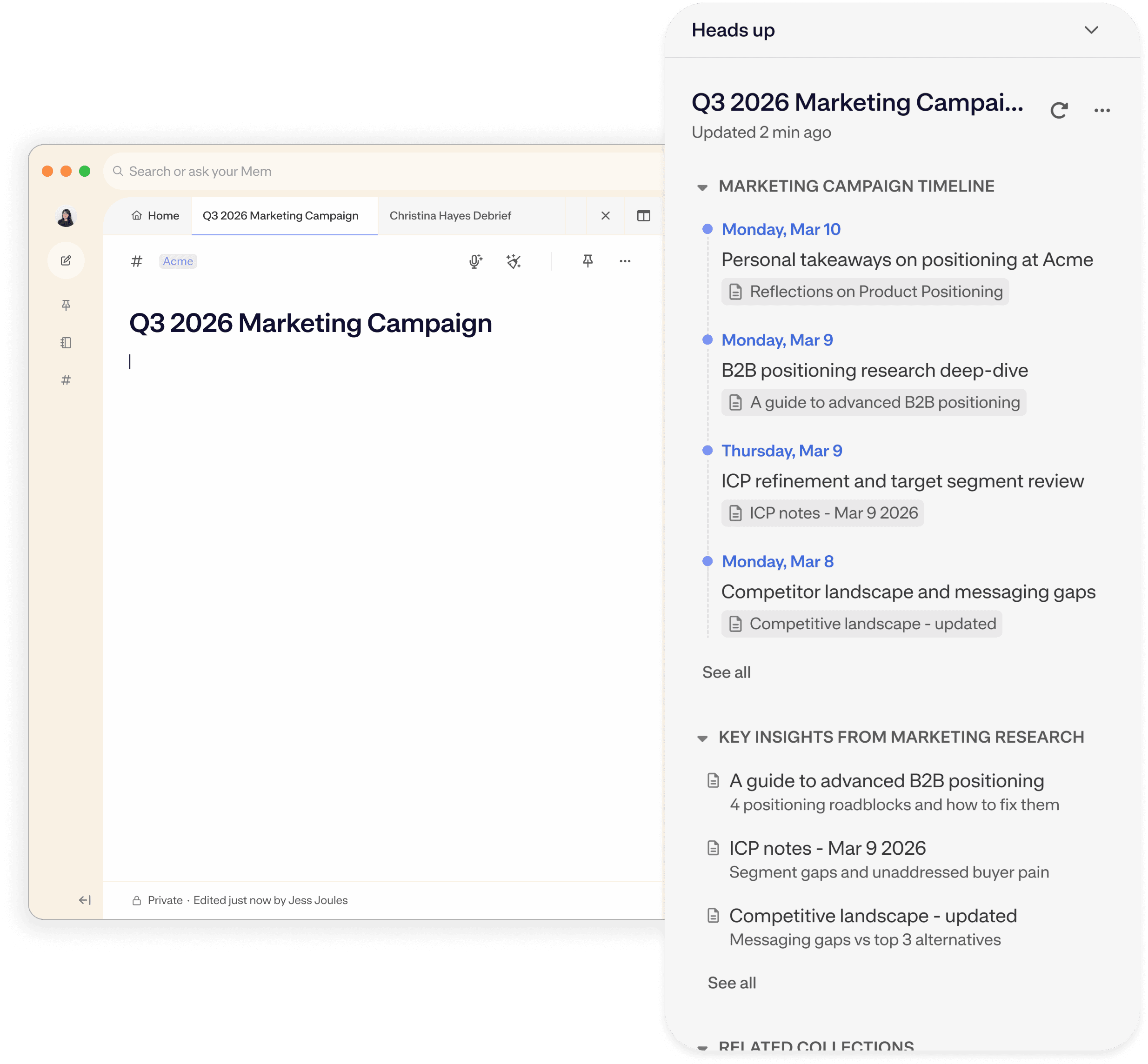 In a shared workspace, Heads Up doesn't just surface your own notes — it surfaces your team's. Open a note and see the full history of past interactions with that client or colleague, including notes your teammates wrote. Start a project doc and find related context from across the team automatically.