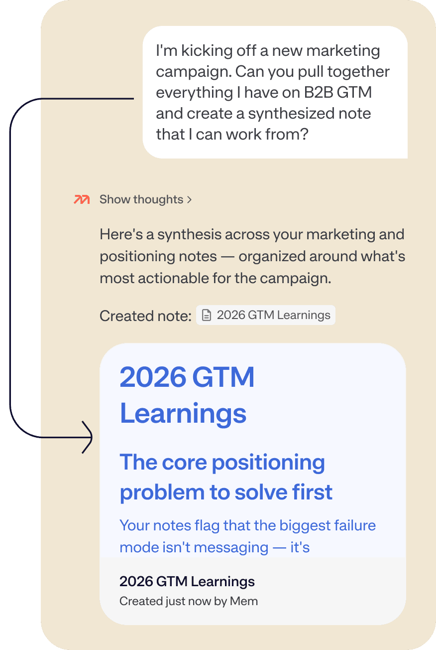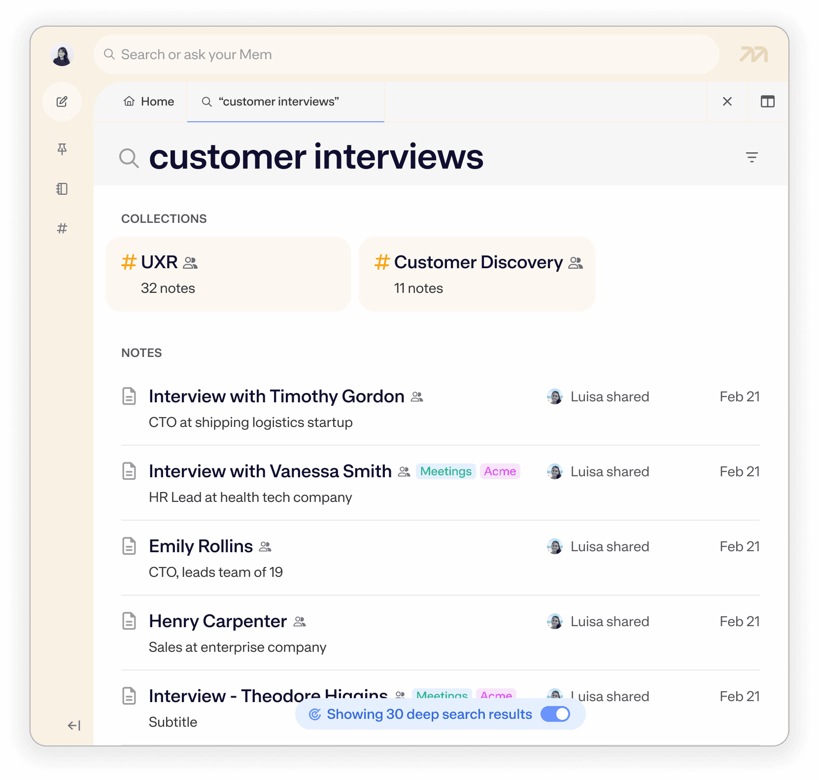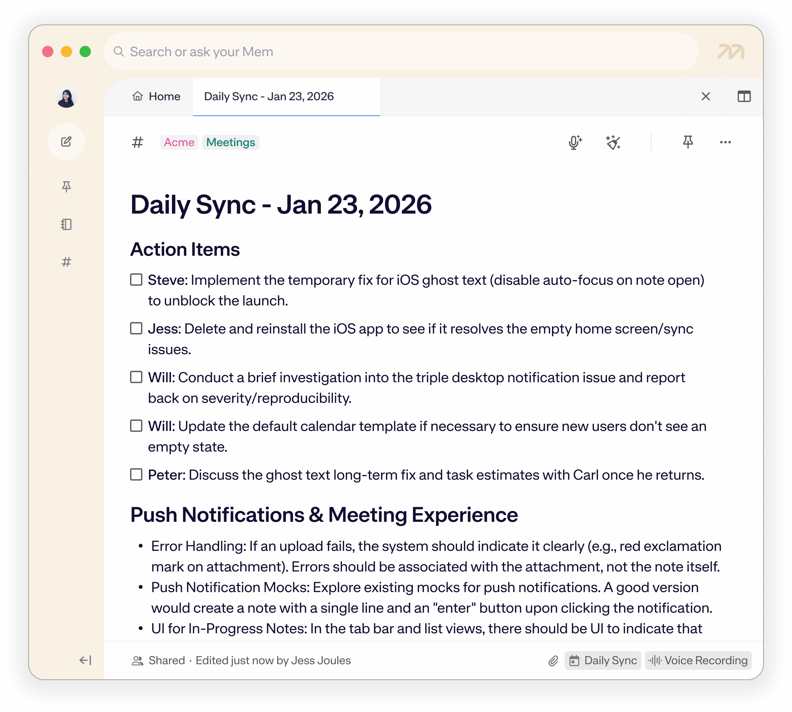 Mem's natural language search works across everything in your shared workspace, so any teammate can find any note, decision, or piece of context without needing to remember exactly how it was titled or organized.