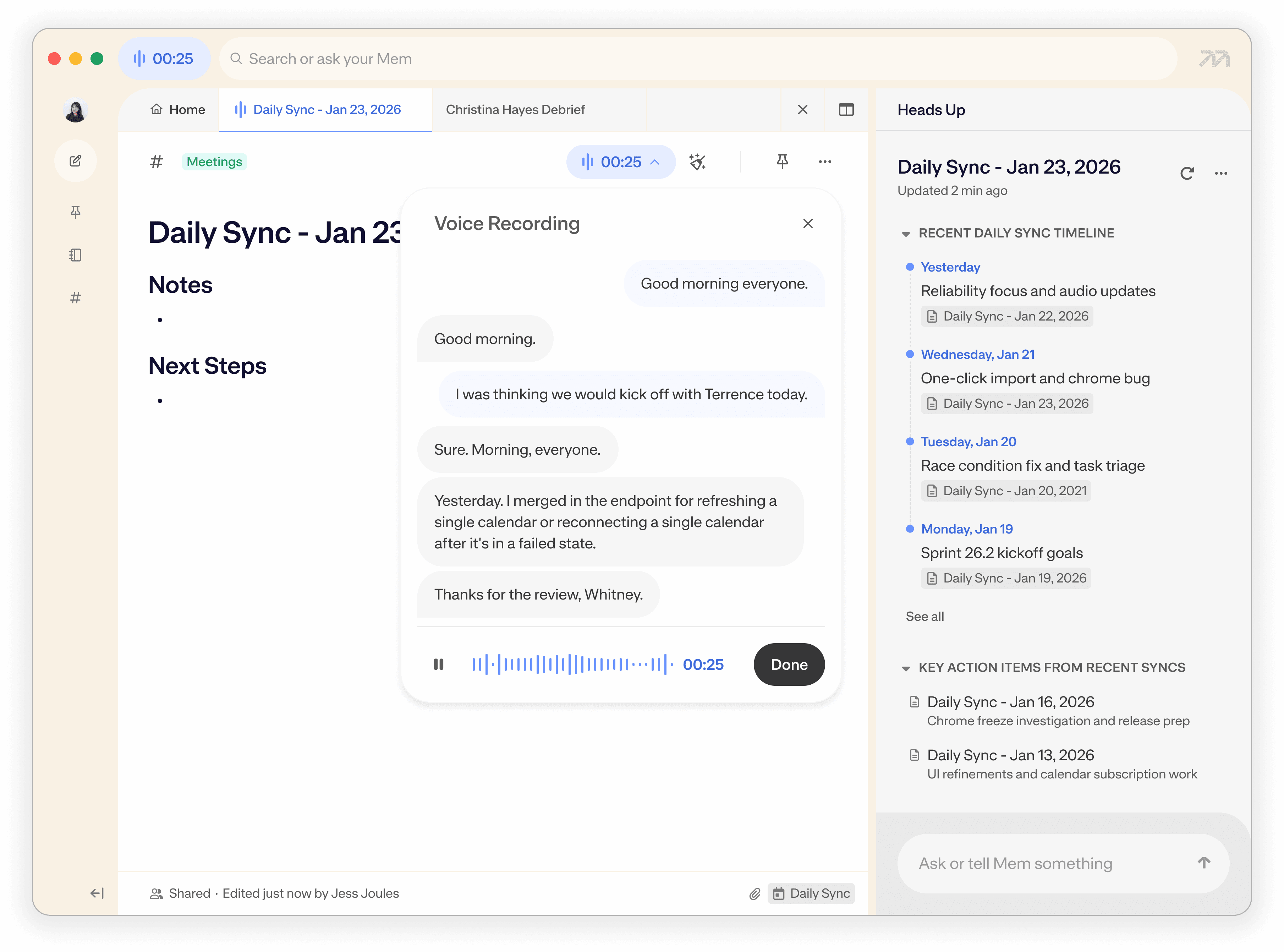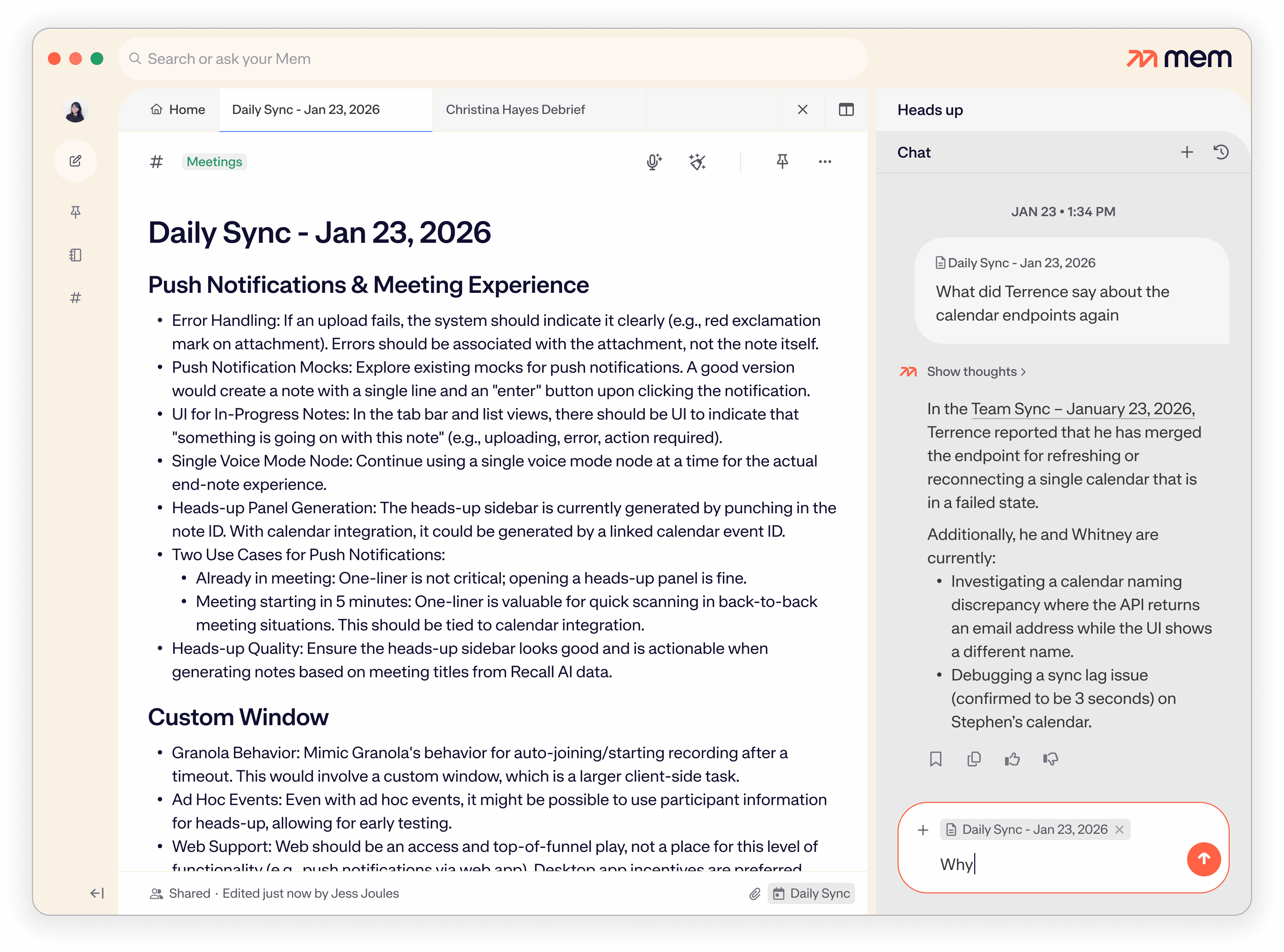 Ask Mem to synthesize insights from multiple meetings—or confirm details about one