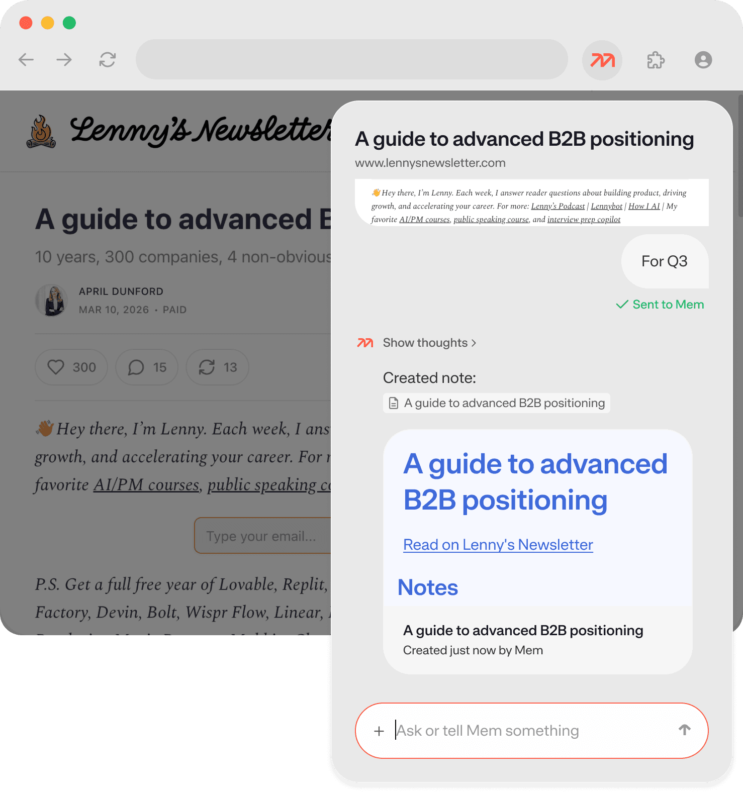 Mem's Chrome extension turns your browser into a research assistant. Save a full article, grab a specific passage, or pull key takeaways from a YouTube video — all without leaving the page. Tell Mem where it goes and how to format it, or let it figure that out on its own.