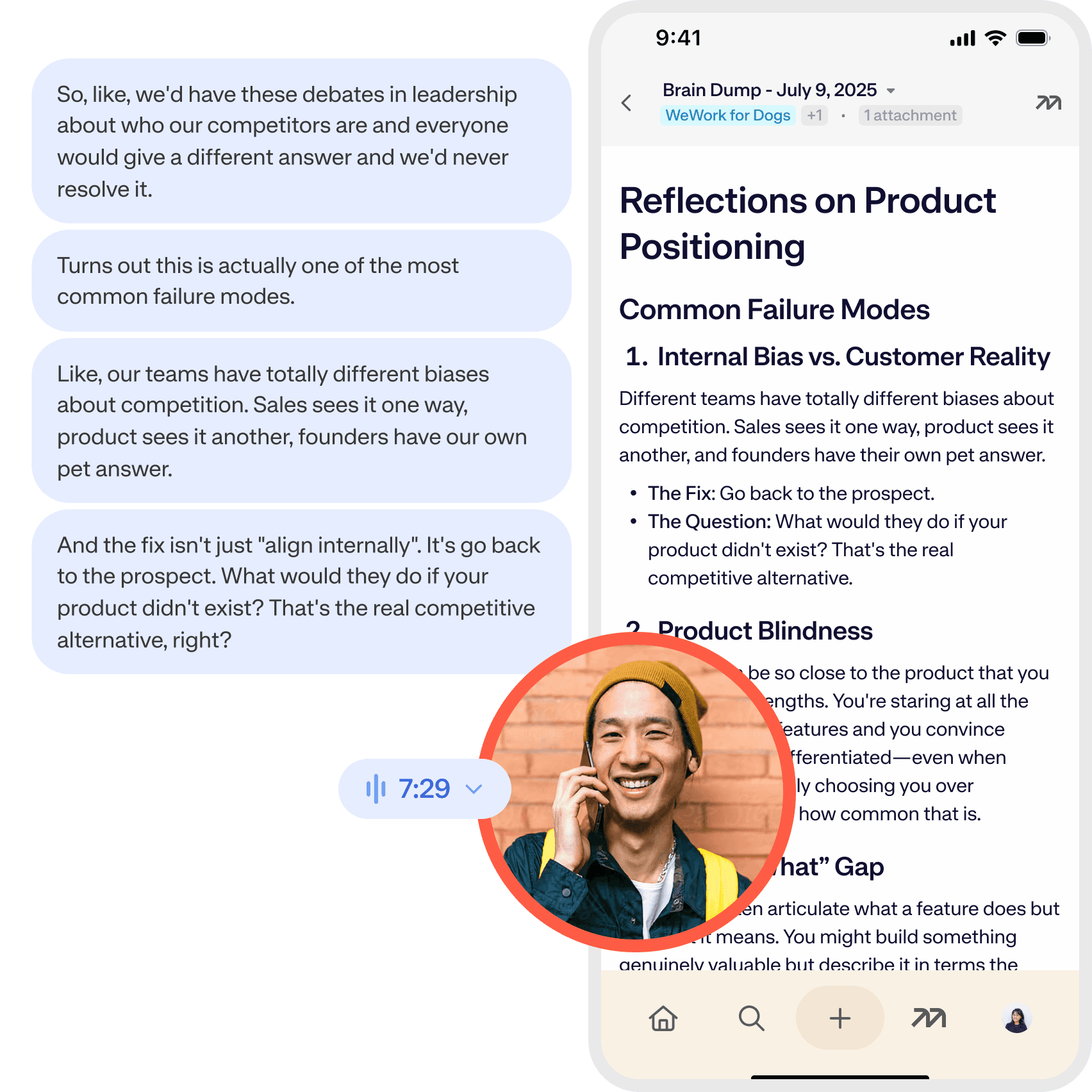 Good research sparks ideas. Voice Mode lets you capture them the moment they hit — whether you're mid-article, commuting, or on lunch break. Just speak to Mem: your half-formed thought, your gut reaction, your "I should look into this" — and Mem turns it into a clean, structured note. No thumbs needed.